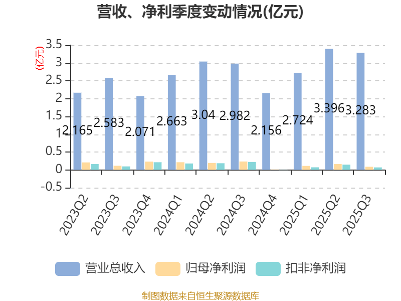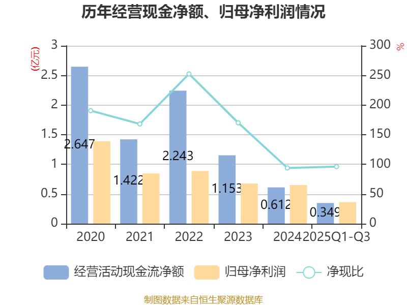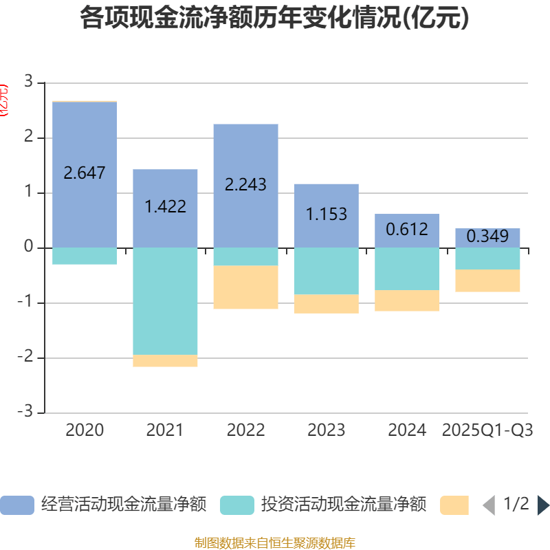 2025年前三季度,公司经营活动现金流净额为3491.95万元,同比下降46.62%;筹资活动现金流净额-4068.22万元,同比增加2348.34万元;投资活动现金流净额-3997.5万元,上年同期为-5970.94万元。