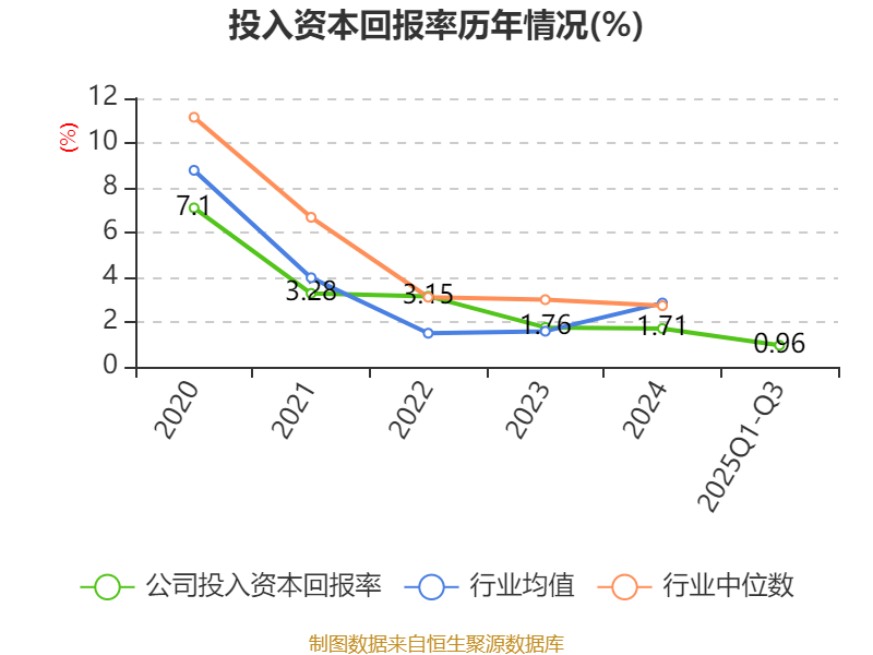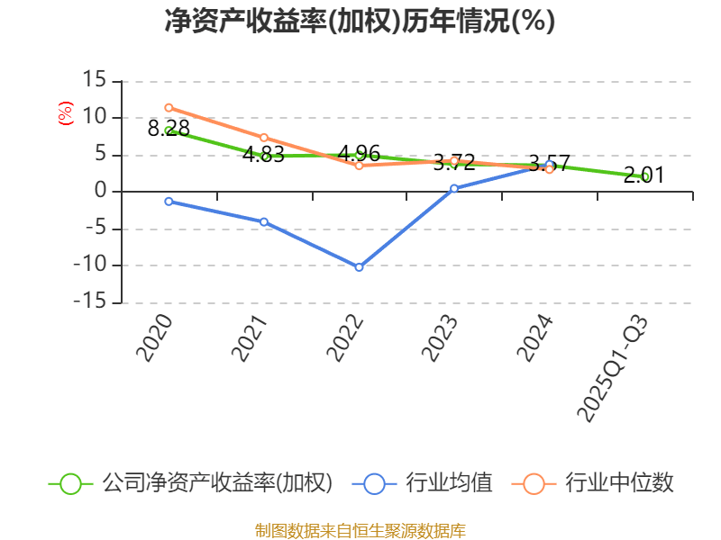 盈利能力方面, 2025年前三季度公司加权平均净资产收益率为2.01%,同比下降1.48个百分点。公司2025年前三季度投入资本回报率为0.96%,较上年同期下降1.3个百分点。