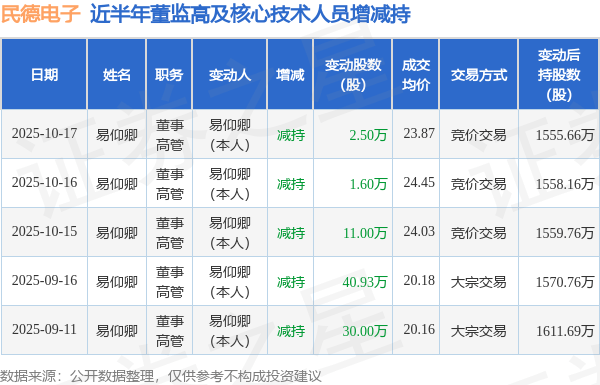 证券之星消息,根据10月20日市场公开信息、上市公司公告及交易所披露数据整理,民德电子(300656)最新董监高及相关人员股份变动情况:2025年10月17日公司董事,高管易仰卿共减持公司股份2.5万股,占公司总股本为0.0146%。变动期间公司股价下跌3.81%,10月17日当日收盘报23.23元。