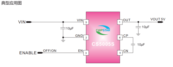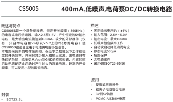 CS5005 是400mA 低噪声电荷泵 DC/DC 转换器,主打 “固定 5V 输出 + 低外围依赖 + 高稳定性”,专为电池供电的小型设备设计。其采用新型电荷泵架构,实现恒定 360KHz 开关频率,零负载时仍保持频率稳定,同时减少输入与输出纹波;仅需 1 只自举电容 + 2 只旁路电容即可搭建电路,有效简化设计、节省 PCB 面积,适配便携式音响设备、锂离子电池备份电源、3V-5V 电压转换、PCMCIA 本地 5V 电源等场景。