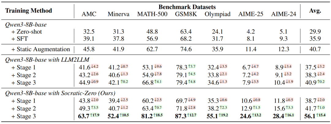 在 7 个数学推理基准(AMC23、AIME24/25、Olympiad、MATH-500、Minerva、GSM8K)上,Socratic-Solver-8B(基于 Qwen3-8B)平均准确率达 56.1%,相比 MetaMath 和 WizardMath(平均 40.7%),绝对提升 +15.4 个百分点;相比 LLM2LLM 提升 +15.2 个百分点。