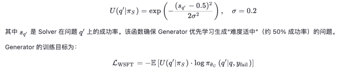 为避免持续调用昂贵的 Teacher,Generator 通过 Weighted Supervised Fine-Tuning (WSFT) 学习其出题策略。关键创新在于引入价值函数: