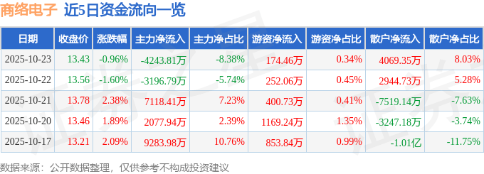 证券之星消息,截至2025年10月23日收盘,商络电子(300975)报收于13.43元,下跌0.96%,换手率7.8%,成交量38.38万手,成交额5.07亿元。