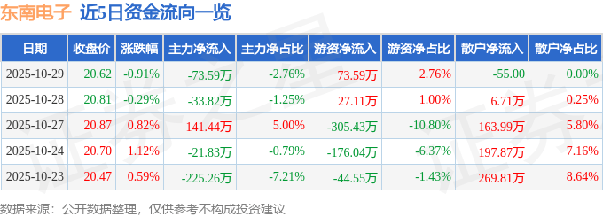 证券之星消息,截至2025年10月29日收盘,东南电子(301359)报收于20.62元,下跌0.91%,换手率3.6%,成交量1.29万手,成交额2667.38万元。