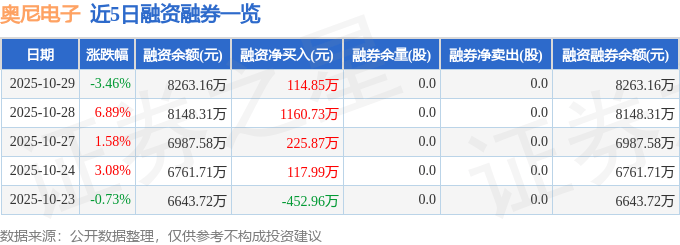 奥尼电子融资融券信息显示,融资方面,当日融资买入1960.53万元,融资偿还1845.69万元,融资净买入114.85万元,连续3日净买入累计1501.45万元。融券方面,融券卖出0.0股,融券偿还0.0股,融券余量0.0股,融券余额0.0万元。融资融券余额8263.16万元。