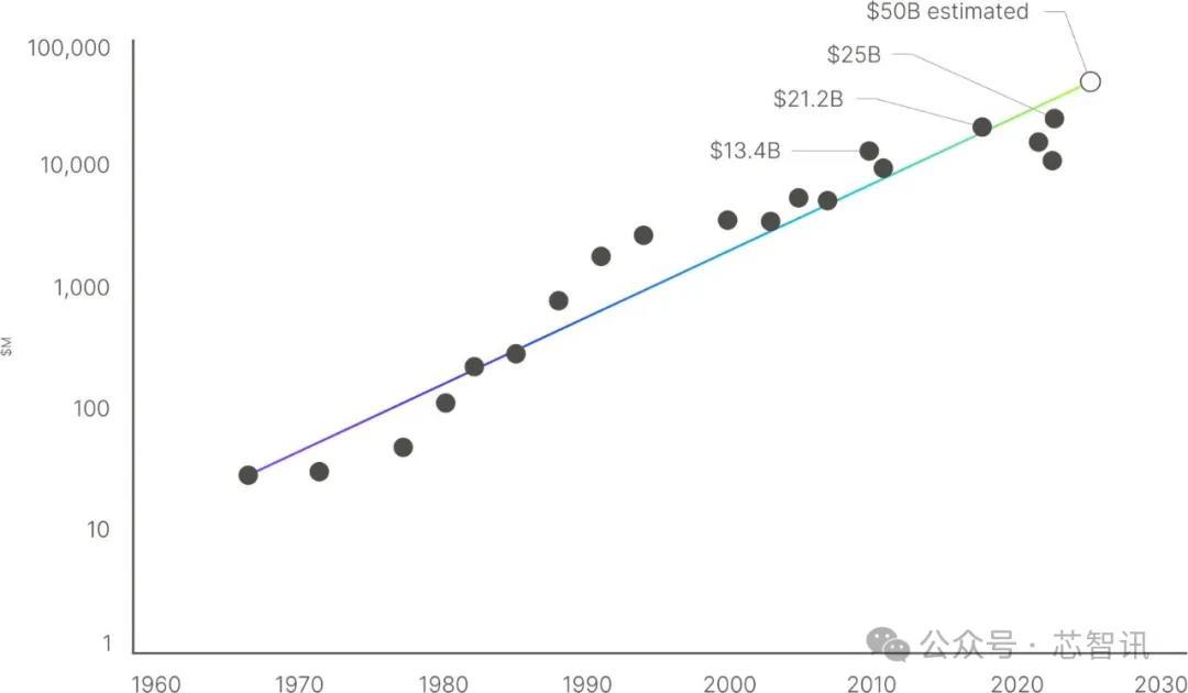 △随着时间的推移,前沿半导体制造设施的成本呈稳步上升趋势