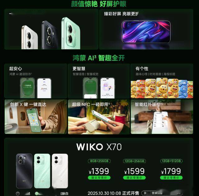 今天,鸿蒙生态手机WIKO X70 发布了,各方面都非常不错,性价比非常高,多项华为技术支持,售价仅仅1399元起售,唯一的遗憾,应该就是没有搭载华为麒麟芯片。