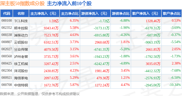 资金流向方面,深主板50(399750)指数成份股当日主力资金净流出合计70.09亿元,游资资金净流入合计18.79亿元,散户资金净流入合计51.3亿元。成份股资金流向详情见下表: