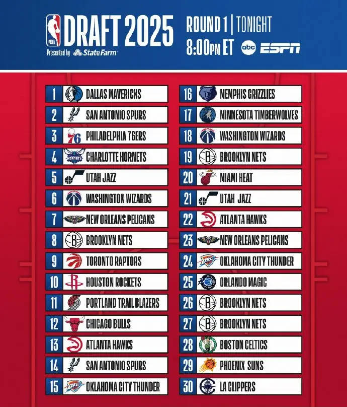 北京时间2025年6月26日,NBA官方公布了首轮选秀顺位表。(注:休斯顿仍官方持有10号签(实际将归菲尼克斯),亚特兰大仍官方持有22号签(实际将归布鲁克林),这些签位需到7月6日才可交易。)
