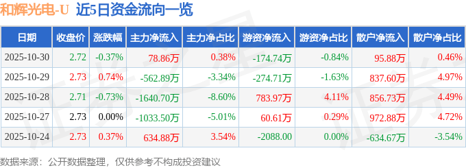 证券之星消息,截至2025年10月30日收盘,和辉光电(688538)报收于2.72元,下跌0.37%,换手率1.33%,成交量76.42万手,成交额2.09亿元。