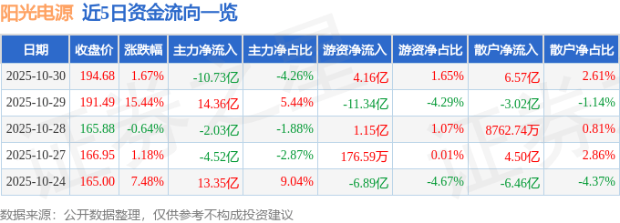 证券之星消息,截至2025年10月30日收盘,阳光电源(300274)报收于194.68元,上涨1.67%,换手率8.0%,成交量127.18万手,成交额252.03亿元。