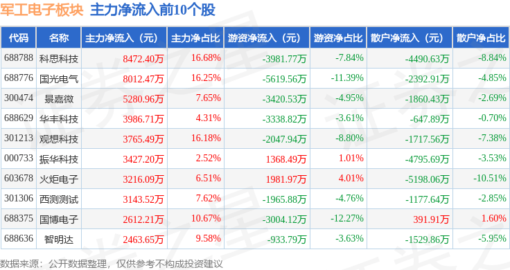 从资金流向上来看,当日军工电子板块主力资金净流出5.79亿元,游资资金净流入2.61亿元,散户资金净流入3.18亿元。军工电子板块个股资金流向见下表:
