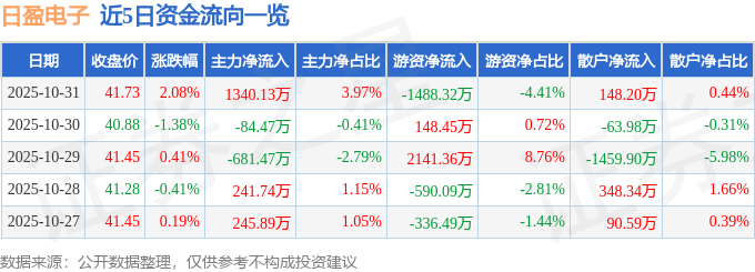 证券之星消息,截至2025年10月31日收盘,日盈电子(603286)报收于41.73元,上涨2.08%,换手率6.97%,成交量8.04万手,成交额3.37亿元。