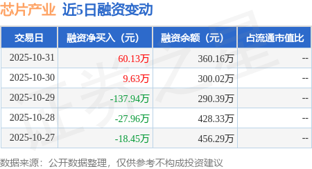证券之星消息,10月31日,芯片产业(159310)融资买入114.81万元,融资偿还54.67万元,融资净买入60.13万元,融资余额360.16万元。