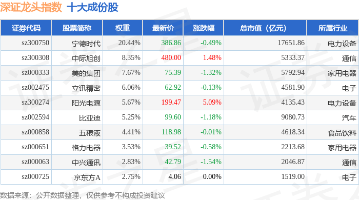 证券之星消息,11月3日,深证龙头(399653)指数报收于3083.17点,涨0.03%,成交1203.36亿元,换手率1.32%。当日该指数成份股中,上涨的有26家,阳光电源以5.09%的涨幅领涨,下跌的有21家,长春高新以3.6%的跌幅领跌。