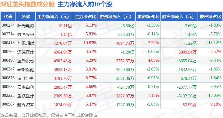 资金流向方面,深证龙头(399653)指数成份股当日主力资金净流出合计44.79亿元,游资资金净流入合计6.85亿元,散户资金净流入合计37.93亿元。成份股资金流向详情见下表: