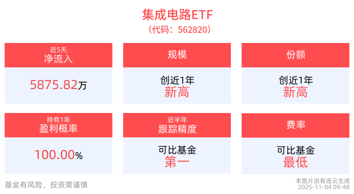 截至11月3日,集成电路ETF近1年净值上涨60.82%,指数股票型基金排名196/3101,居于前6.32%。从收益能力看,截至2025年11月3日,集成电路ETF自成立以来,最高单月回报为31.86%,最长连涨月数为4个月,最长连涨涨幅为58.99%,上涨月份平均收益率为9.89%。