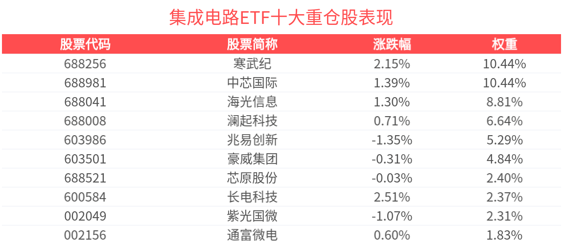 数据显示,截至2025年10月31日,中证全指集成电路全收益指数前十大权重股分别为寒武纪、中芯国际、海光信息、澜起科技、兆易创新、豪威集团、长电科技、芯原股份、紫光国微、通富微电,前十大权重股合计占比55.88%。