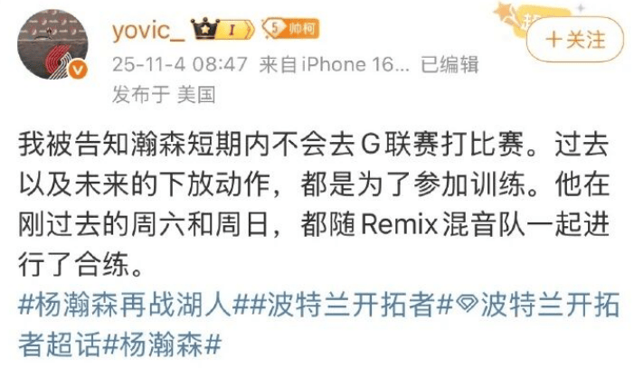 11月3日,据向阳视频,@波兰特开拓者 官宣:我们已经从发展联盟混音队召回了中锋杨瀚森。