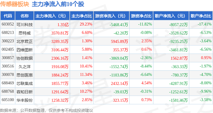 从资金流向上来看,当日传感器板块主力资金净流出42.79亿元,游资资金净流入15.59亿元,散户资金净流入27.2亿元。传感器板块个股资金流向见下表: