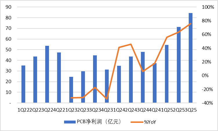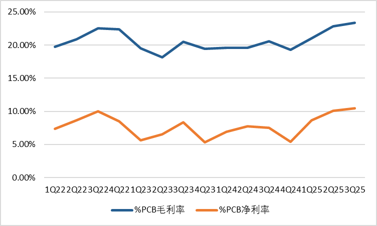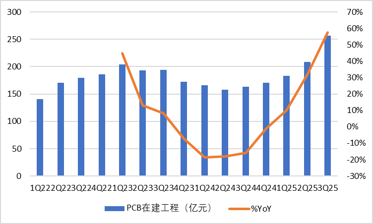 【印制电路板(PCB)】2025Q3实现营业收入805.50亿元,yoy+26.1%;净利润84.29亿元,yoy+75.6%。2025Q3销售毛利率/销售净利率分别为23.38%/10.46%,分别yoy+2.80pct/+2.95pct。在建工程方面,2025Q3末余额总计为256.86亿元,yoy+57.4%。