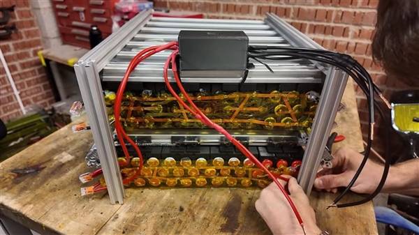 随后,他将这些模块连接在一起,组装成最终的电池包,这个电池包被安装在他的工作室墙上,输出电压约为50伏特。