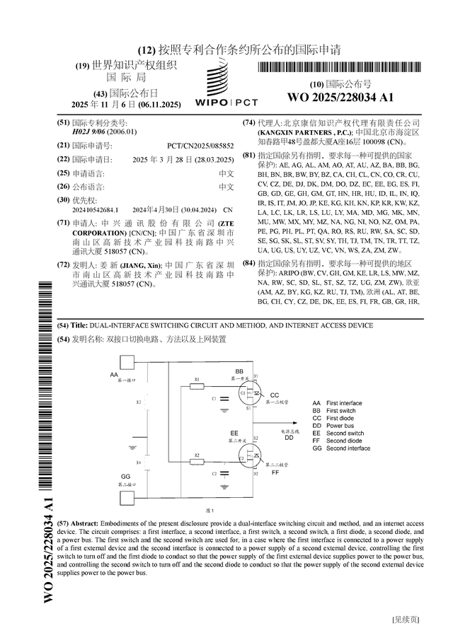 证券之星消息,根据企查查数据显示中兴通讯(000063)公布了一项国际专利申请,专利名为“双接口切换电路、方法以及上网装置”,专利申请号为PCT/CN2025/085852,国际公布日为2025年11月6日。