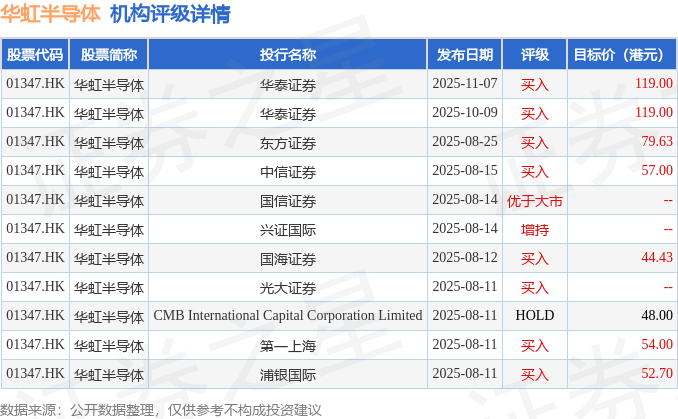 投行对该股的评级以买入为主,近90天内共有8家投行给出买入评级,近90天的目标均价为71.72港元。华泰证券最新一份研报给予华虹半导体买入评级,目标价119港元。