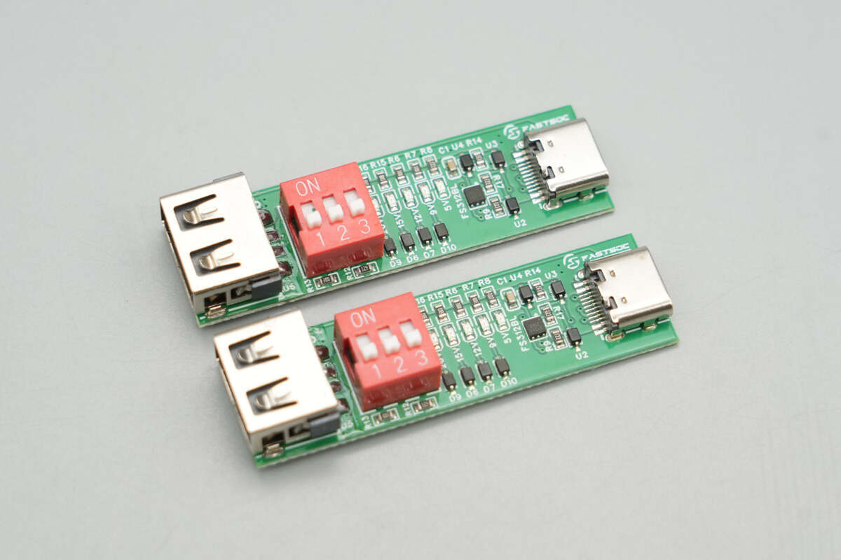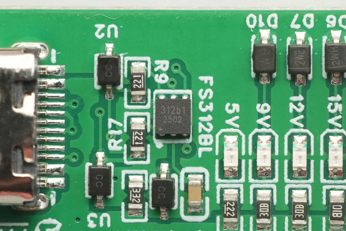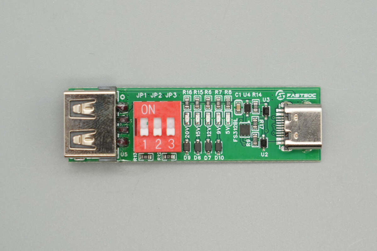 该方案核心主控速芯微 FS312B 采用 DFN2×2-6L 封装,承担协议握手与电压申请;搭配三位拨码开关实现档位选择,通过二极管网络、限流电阻构成的译码驱动电路控制 LED 点亮,直观显示 5V/9V/12V/15V/20V 档位;同时集成 USB-C与 USB-A 双母座,辅以 ESD 防护、滤波限流器件及取样检测网络,背面 VBUS 与 GND 焊盘进一步拓展使用场景。