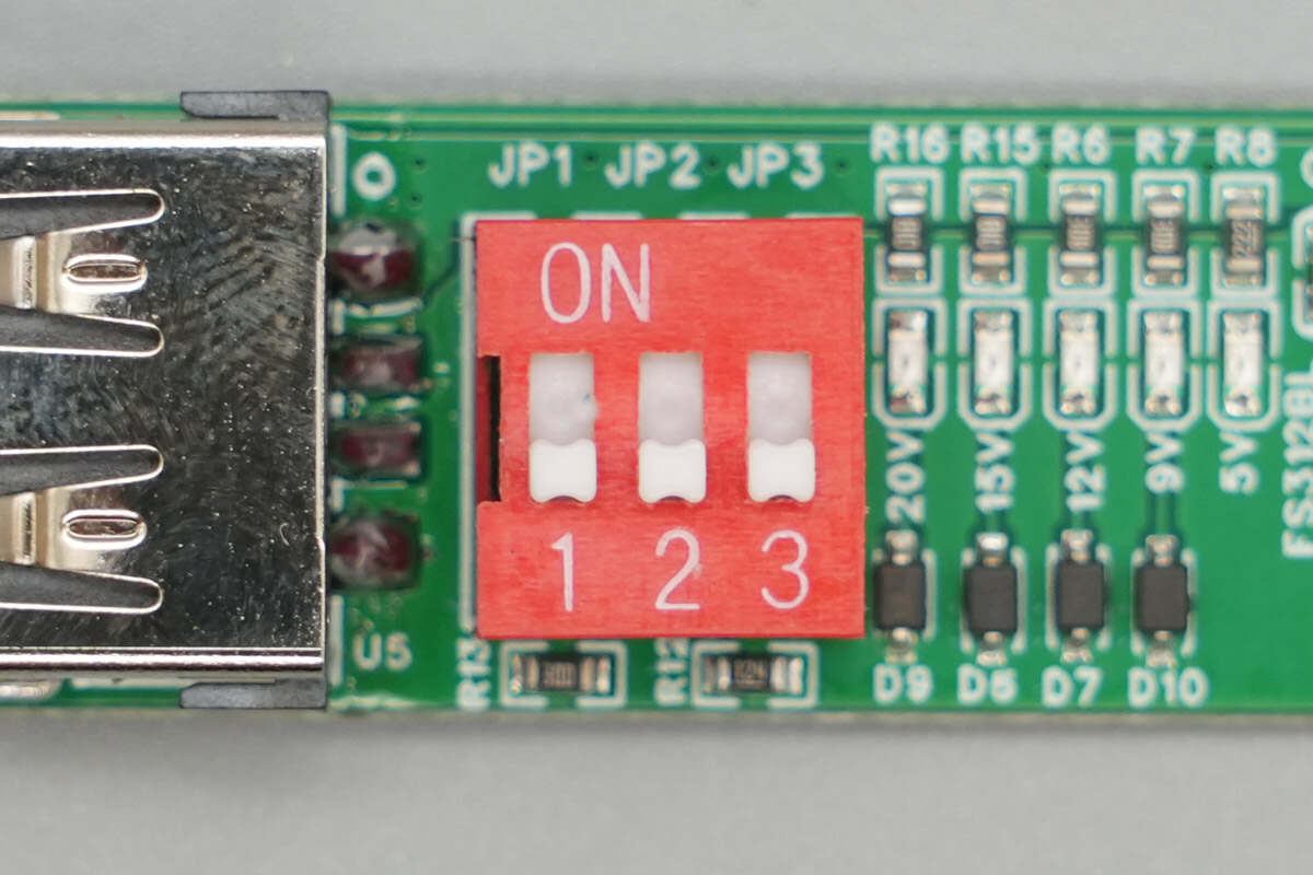 三位拨码开关特写,用于选择诱骗电压档位,与 FS312BL 协同完成 PD/QC 电压申请。