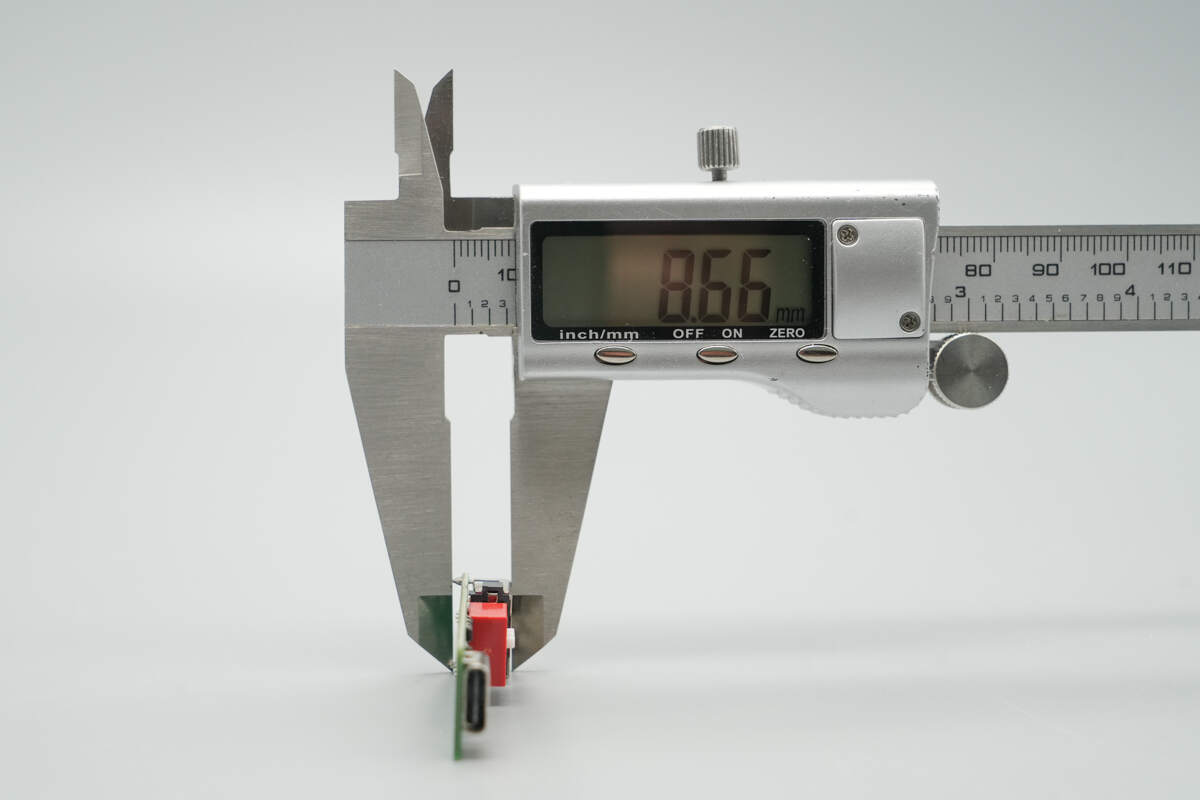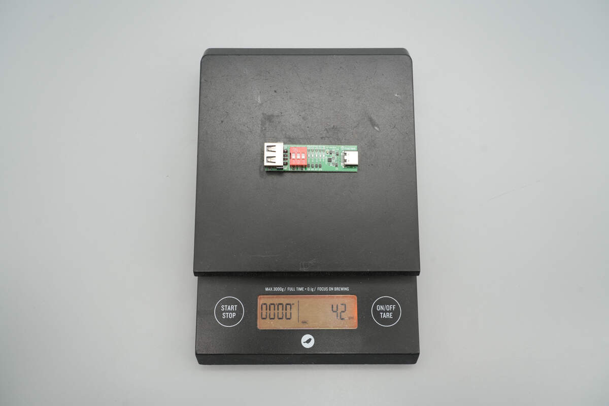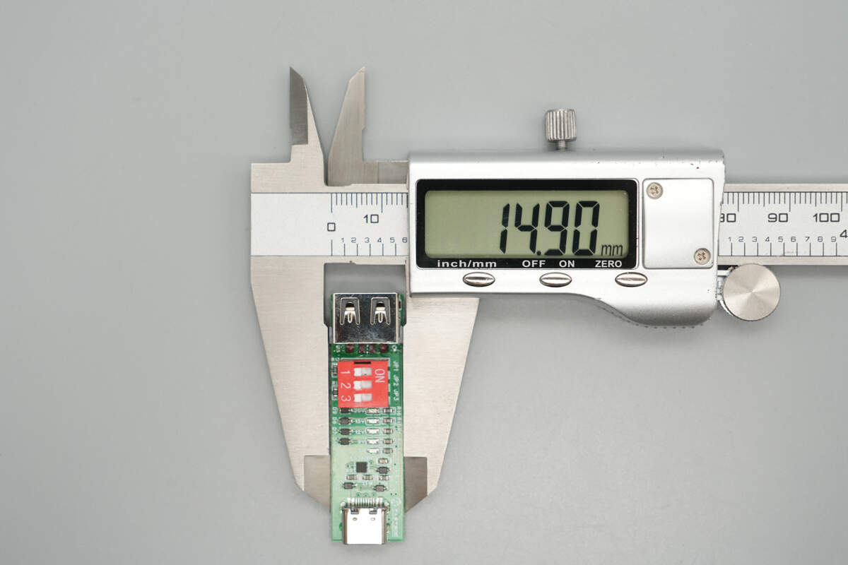 PowerPi 开源电压诱骗器采用极简外围设计,兼容 PD 3.0/3.1、QC 3.0 等主流快充协议,可自动完成电压握手与申请,产品结构紧凑,尺寸为 50.14mm×14.9mm×8.66mm、重量约 4.2g,配备 USB-C 母座与 USB-A 母座,中部设三位拨码开关用于选择电压档位,辅以 LED 指示电路,左侧集成 ESD 防护与滤波限流器件,背面含 VBUS/GND 大面积焊盘。