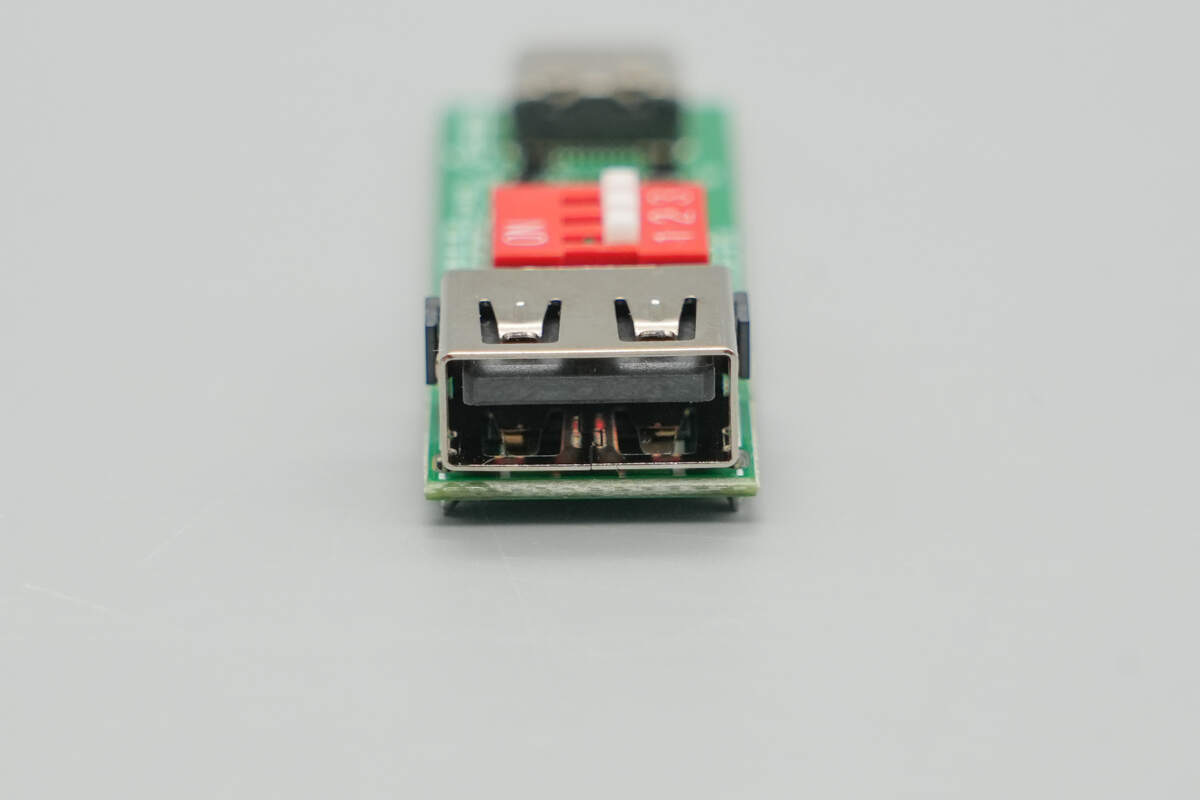 PowerPi 开源电压诱骗器一览正面一览,左侧为 USB-A 母座,用作被诱骗电压的输出口,旁边紧贴若干小封装器件,承担 ESD 防护与滤波限流。中部的红色三位拨码开关负责设定目标电压;再向右是由电阻、电容构成的取样与指示驱动网络,用于为主控提供状态检测与指示电流。