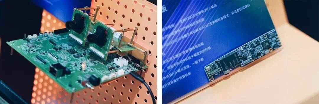 V881系列芯片;左下图为基于V811的双4K+AI硬件评估开发板;右下图则为基于V881的AI眼镜硬件板;这颗芯片基于双核玄铁C907+单核E907,配有1TOPS NPU,支持4K30 H.264/H.265视频编码,支持24MP拍照;支持畸变矫正/EIS防抖/PDAF对焦;连接方面则升级为对Wi-Fi 6 2.4GHz+5GHz,以及BLE的支持;特别适用于AI眼镜、AI穿戴相机等AI视觉类产品...