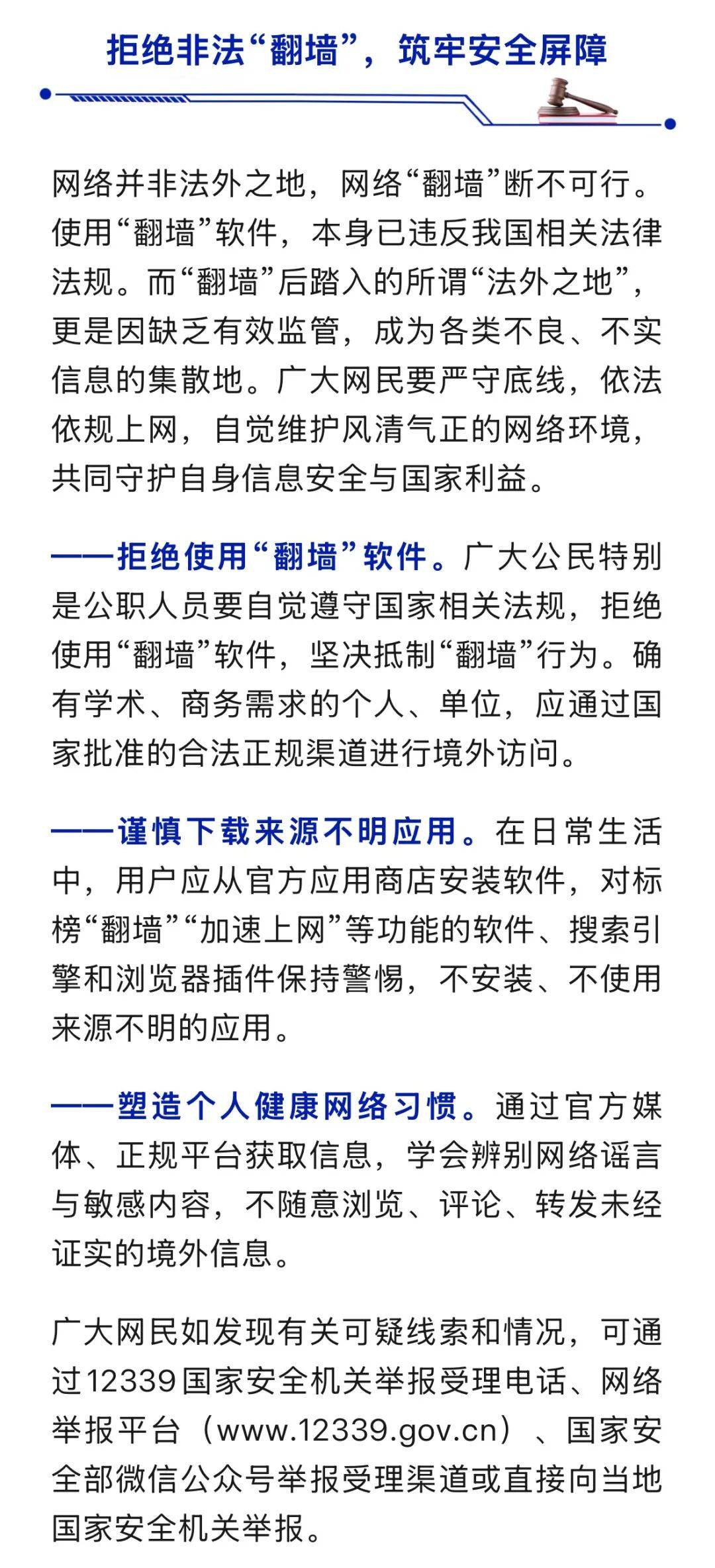在移动互联网时代,通过互联网获取信息资讯已成为我们了解外部世界的普遍方式,但个别网民法律和风险防范意识淡薄,违法使用“翻墙”软件(俗称VPN或“梯子”)访问境外网站、注册账号以及参与群组聊天。贪图猎奇不仅可能带来个人信息安全风险,甚至影响国家安全和社会稳定。