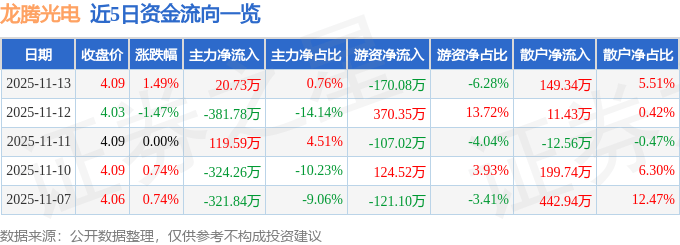 证券之星消息,截至2025年11月13日收盘,龙腾光电(688055)报收于4.09元,上涨1.49%,换手率0.2%,成交量6.66万手,成交额2710.12万元。