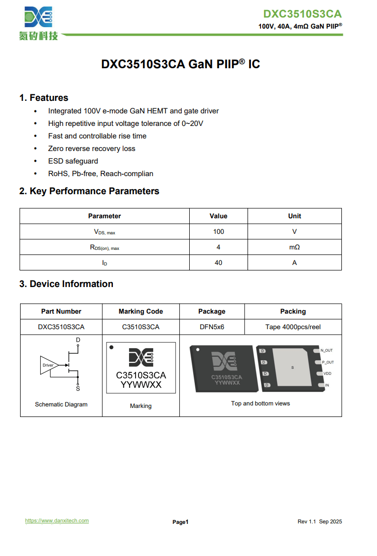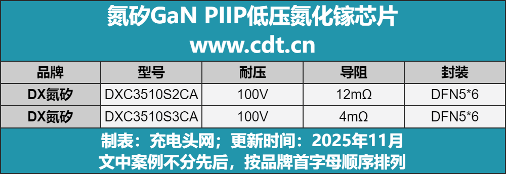 DXC3510S3CA是氮矽科技推出的GaN PIIP芯片,该芯片将100 V 增强型GaN HEMT与驱动器集成在DFN 5×6封装内,导阻为4mΩ。该器件同样具备0~20V的宽范围输入耐压能力,可适应复杂的电压波动环境,同时支持超高开关频率,显著提升系统功率密度和响应速度。