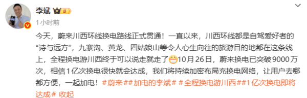 【CNMO科技消息】11月18日,蔚来正式宣布川西环线换电路线全线贯通。蔚来创始人、CEO李斌在社交媒体上表示,10月26日,蔚来换电已突破9000万次,相信1亿次换电很快就会达成。
