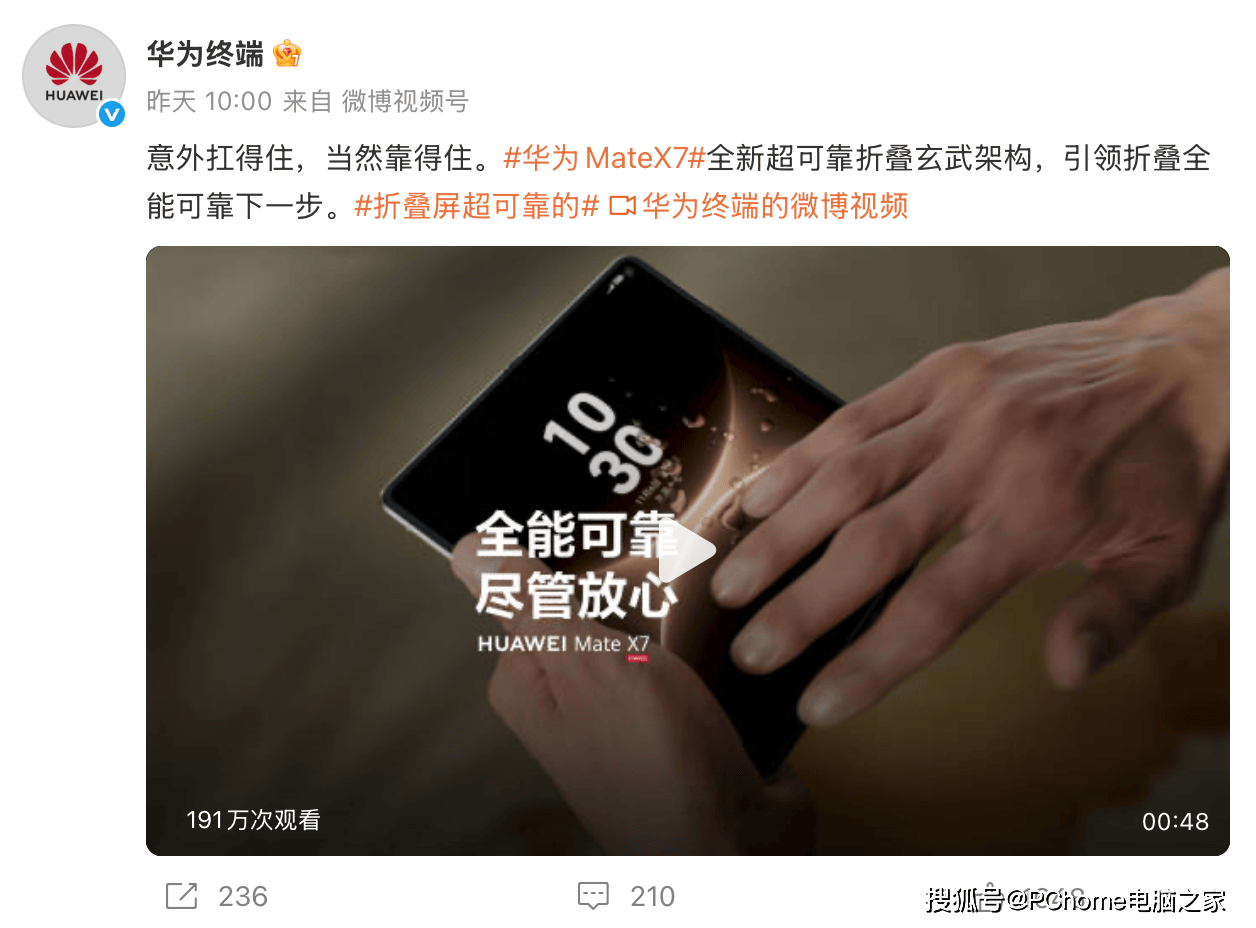 2025年11月19日,华为终端官微发布消息称,华为Mate X7折叠屏手机今日开启预定。