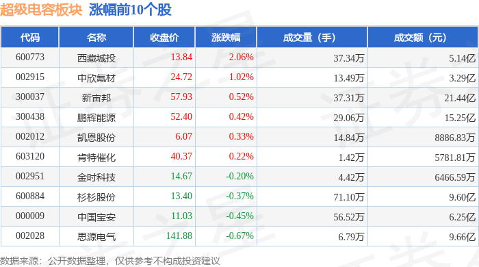 证券之星消息,11月19日超级电容板块较上一交易日下跌1.1%,丰元股份领跌。当日上证指数报收于3946.74,上涨0.18%。深证成指报收于13080.09,下跌0.0%。超级电容板块个股涨跌见下表: