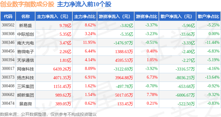 资金流向方面,创业数字(399263)指数成份股当日主力资金净流出合计15.35亿元,游资资金净流入合计2.95亿元,散户资金净流入合计12.39亿元。成份股资金流向详情见下表: