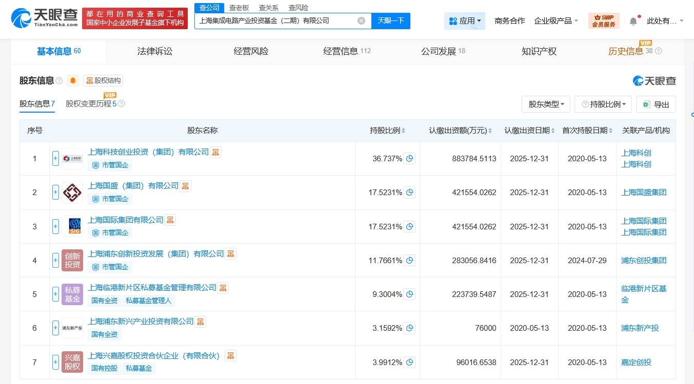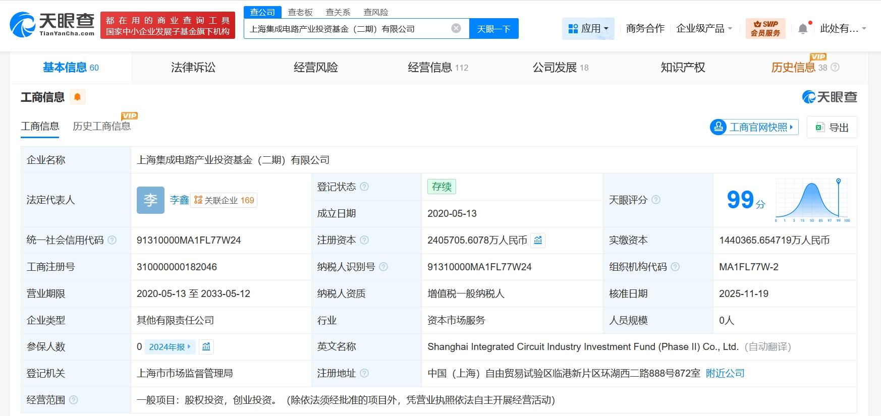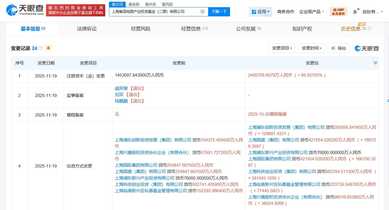 天眼查工商信息显示,近日,上海集成电路产业投资基金(二期)有限公司发生工商变更,注册资本由约145.3亿人民币增至约240.6亿人民币,增幅约66%,同时,部分高管发生变更。