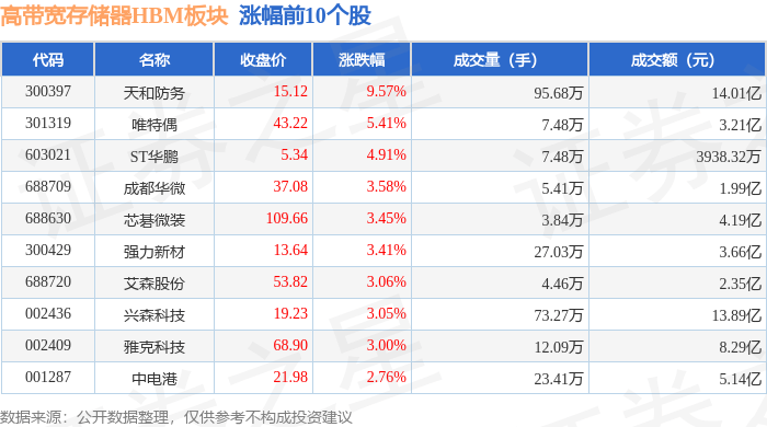 证券之星消息,11月24日高带宽存储器HBM板块较上一交易日上涨0.92%,天和防务领涨。当日上证指数报收于3836.77,上涨0.05%。深证成指报收于12585.08,上涨0.37%。高带宽存储器HBM板块个股涨跌见下表: