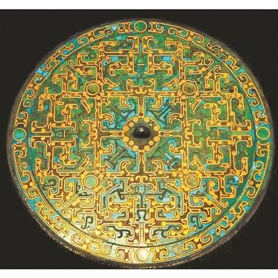 这件铜镜的工艺十分复杂,工匠需要先刻出螭龙纹的槽,在预设的凹槽中嵌入细如发丝的金线,一丝不苟地勾勒出龙鳞与关节的轮廓,也就是错金工艺,之后反复打磨平整,在镜钮和金线周围镶嵌一颗颗绿松石。最令人惊叹的是它的图案是如此绚丽,横平竖直、华丽转弯,在那个没有CAD制图的年代,能刻画出如此规律且具有对称美的线条,不得不佩服古人的高超技艺。