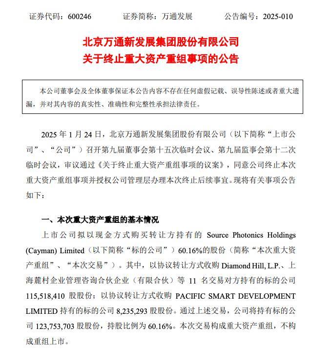 1月27日,万通发展公告披露,审议通过《关于终止重大资产重组事项的议案》,同意万通发展终止以现金方式购买转让方持有的索尔思光电60.16%的股份的重大资产重组事项。