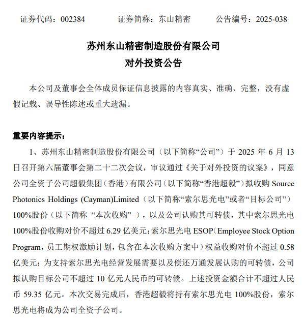 公告显示,索尔思光电100%股份收购对价不超过6.29亿美元,索尔思光电ESOP(Employee Stock Option Program,员工期权激励计划)权益收购对价不超过0.58亿美元。此外,东山精密拟认购索尔思光电不超过10亿元人民币的可转债。投资金额合计不超过人民币59.35亿元。交易完成后,索尔思光电将成为东山精密全资子公司。