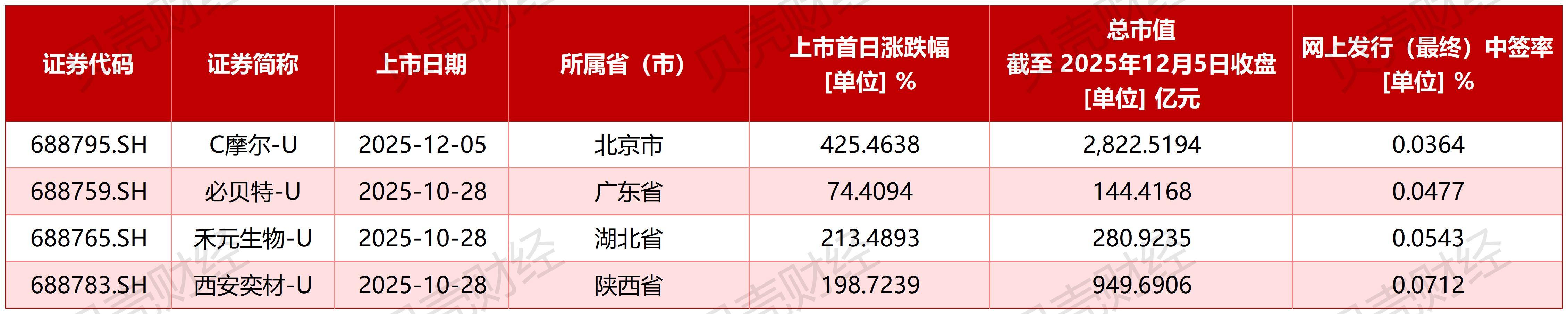 2025年内已上市的4家尚未盈利科创板成长层企业中签率等情况比较(截至2025年12月7日,数据来源:Wind)