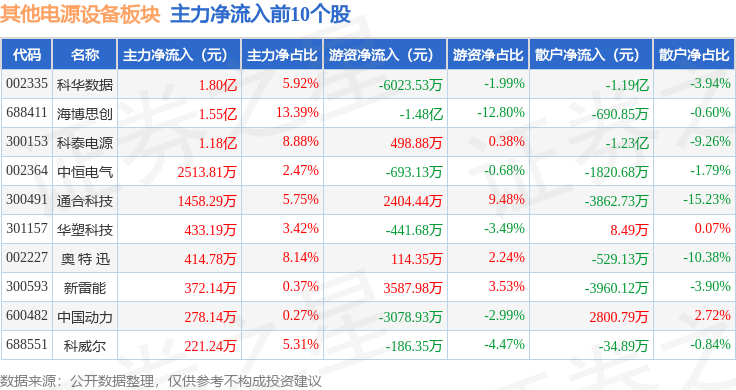 从资金流向上来看,当日其他电源设备板块主力资金净流出4184.41万元,游资资金净流出1.69亿元,散户资金净流入2.11亿元。其他电源设备板块个股资金流向见下表: