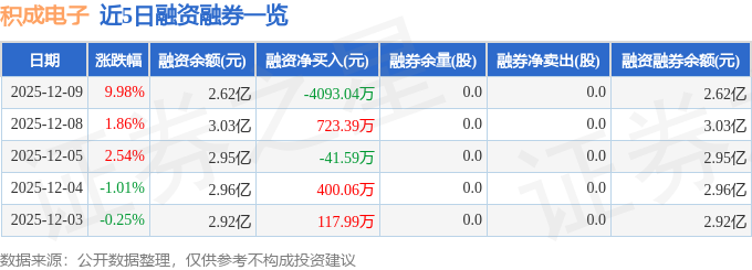 积成电子融资融券信息显示,融资方面,当日融资买入2759.24万元,融资偿还6852.28万元,融资净偿还4093.04万元。融券方面,融券卖出0.0股,融券偿还0.0股,融券余量0.0股,融券余额0.0万元。融资融券余额2.62亿元。