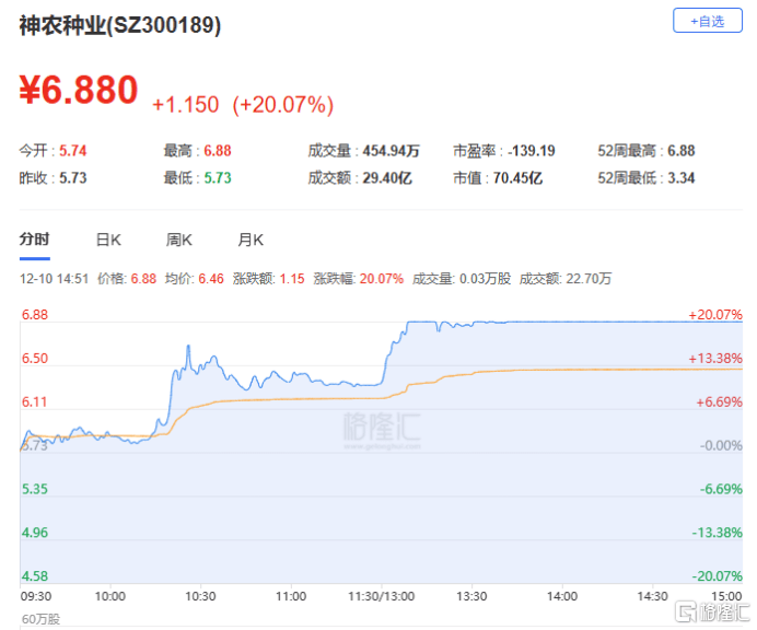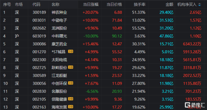 龙虎榜中涉及机构专用席位的个股中,单日净买入额前三为神农种业、中瓷电子、龙洲股份,分别为4.06亿、4.21亿、2.45亿。