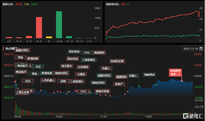 12月10日,沪指跌0.23%报3900点,深证成指涨0.29%,创业板指跌0.02%。全市场成交额1.79万亿元,超2800股下跌。海南板块、免税概念、贵金属、共享经济、商业百货及教育等板块涨幅居前;培育钻石、电源设备、乳业股等板块跌幅居前。